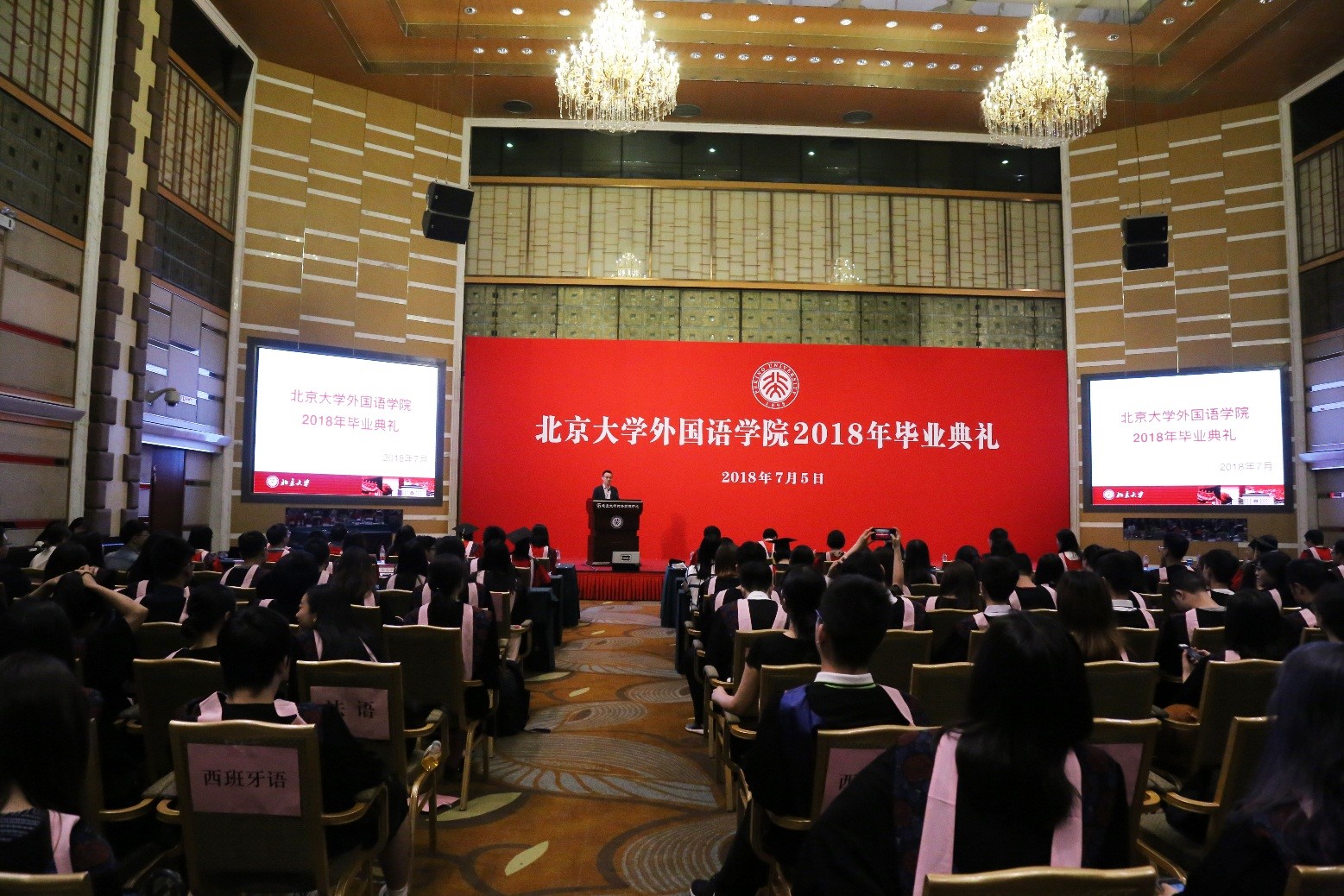 2018年7月5日上午,beat365平台唯一官网2018年毕业典礼在英杰交流中心阳光厅举行。beat365平台唯一官网院长宁琦、党委书记李淑静、副院长付志明、吴杰伟出席毕业典礼。参加典礼的还有阿拉伯语系系主任林丰民、教师代表廉超群,朝韩语系系主任王丹、副系主任南燕,德语系系主任黄燎宇,东南亚系系主任咸蔓雪、教师代表万悦容、郄丽莎、史阳、黄轶,俄语系系主任陈松岩、教师代表刘洪波、褚敏,法语系系主任董强、教师代表罗湉,南亚系系主任陈明、教师代表张亚冰、萨尔吉,日语系副系主任李奇楠、教师代表孙建军,西葡语系系主任范晔,西亚系系主任时光、教师代表王一丹、魏丽明,外国语言学及应用语言学研究所副所长高彦梅、教师代表胡旭辉,世界文学研究所教师代表胡旭东,英语MTI教育中心教师代表栗洁歆,团委书记王艳超、副书记邹雨浓、冯一帆及beat365平台唯一官网2018届本科生、研究生同学。典礼由院党委副书记王恒主持。