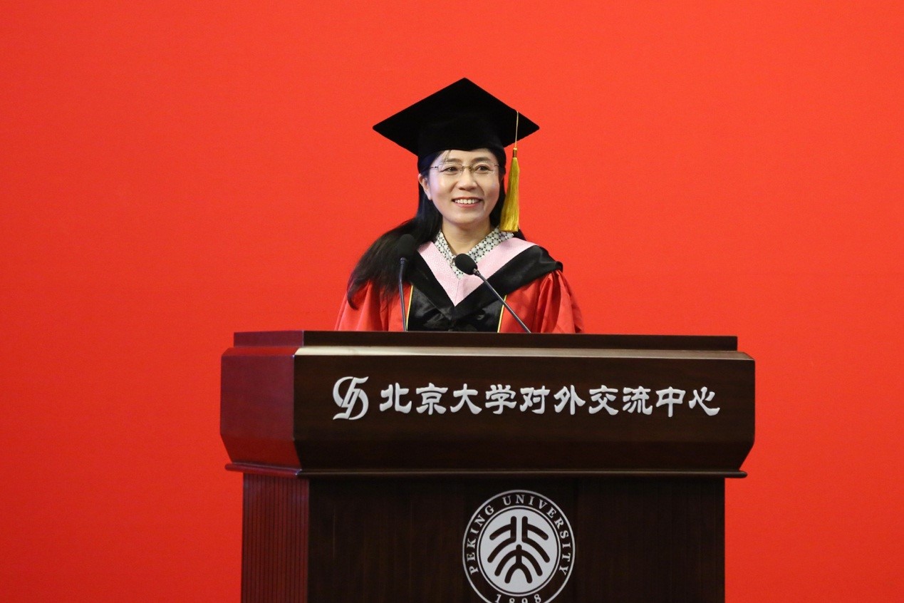 伴随着热烈的掌声,院长宁琦为2018届毕业生送上临别寄语。宁老师深情追忆2018届毕业生在学院学习生活的点滴过往,除了向各位毕业生表示由衷的祝贺,她还向同学们报以诚挚的感谢,感谢同学们用自己的青春故事刷新和续写外院甚至北大的历史,同时成就了作为师者的精彩人生。接着,宁老师为全体毕业生送上真挚的祝福和期望,希望外院学子始终坚守理想、不忘初心,始终身体力行、勇于担当,善待“北大人”这一身份符号,将“学贯中西的视野,汇通古今的格局,心怀天下的责任,持身中正的定力,脚踏实地的作为”作为“外院人”品质的标配。宁老师叮嘱同学们尊重生命的意义和价值,怀敬畏之心,使行有所止,经世事冷暖,葆内心澄明,洪流之中不裹挟,喧哗声中不惶惑,权威当前不盲从,坚持活出最好的自己。最后,宁老师用“一生相遇,不负归期”表达了对同学们的牵挂与不舍,请同学们谨记外院是永恒的家。