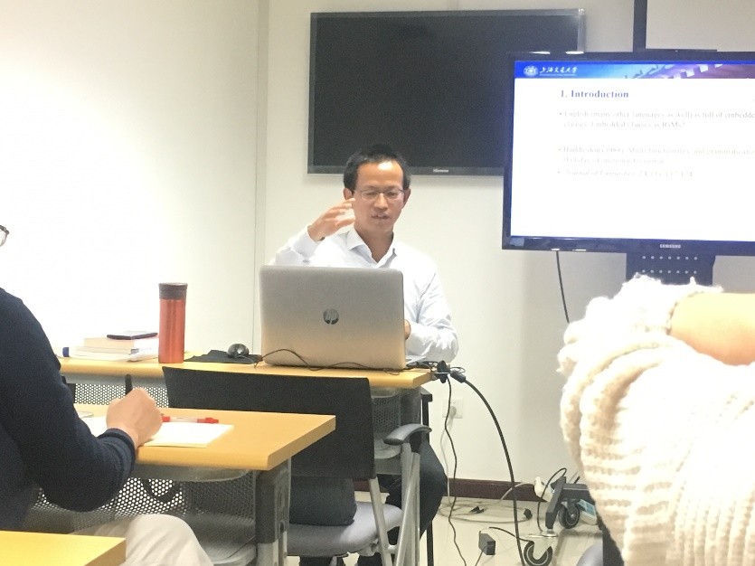 2018年11月23日,上海交通大学杨炳钧教授来beat365平台唯一官网做语言学沙龙。杨教授的题目为《关于概念语法隐喻的完全体现原则:以名词化为例》(Full realization principle for the identification of ideational grammatical metaphor: nominalization as an example)。本次讲座由语言所副所长高彦梅老师主持。来自语言所和北京其他院校的硕博士研究生和进修教师到场聆听讲座。