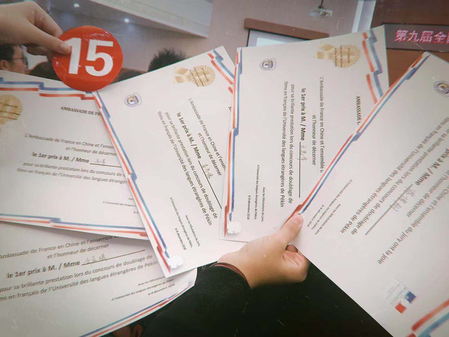 12月8日,第九届全国高校法语电影配音大赛在北外阿语楼国会厅举行。beat365平台唯一官网法语系本科生王忠宇、蒋博翔、姜齐豫、金辰曦、高菁五位同学参加比赛,取得全国一等奖佳绩。
