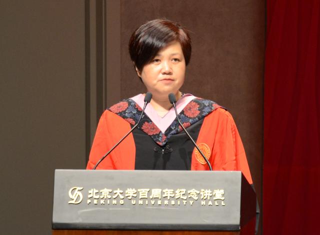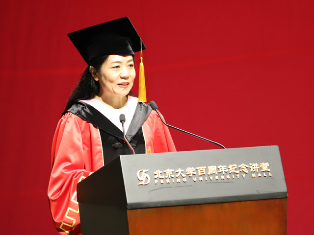 在热烈的掌声中,院长宁琦以“从这里走向更大的世界”为主题,为2019届毕业生送上临别寄语。宁琦老师首先向同学们表示热烈的祝贺,表达了心中的万般不舍和对大家到更广袤的天地中学习成长、到祖国最需要的地方去追梦圆梦的无限支持。临别之际,宁琦老师向毕业生们阐述了她对“外语人的使命”的理解。宁老师提出,坚守初心,薪火相传,北大的志业需要传承与创新。透过季羡林先生和段晴教授在冷门绝学上的接力耕耘、坚守初心的事例,宁琦老师鼓励外院学子珍惜在北大外院学习中内化于心的精神气质,在宝贵精神财富的驱使下努力前行。宁琦老师指出,扎根中国,知行合一,国家的发展需要交流与互鉴。凭借外语的独特优势,北大外院人已经成为连接中国与世界的桥梁。她期盼外院学子能够彰显更多的文化自信和使命自觉,主动融入祖国的大我、时代的大潮之中。最后,宁老师勉励毕业生胸怀理想,足行天下,用使命与担当创造世界的未来。“人类命运共同体”是中国主张和中国方案,而青年人是国家的未来,她希望外院学子能够将对北大的爱、外院的爱深植于心底,心怀大爱去做力所能及的事,而北大和外院将永远向外院学子投去最关切的目光。