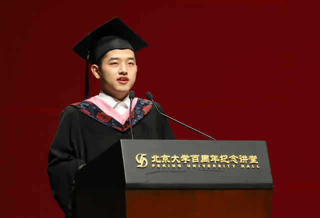 2015级德语系本科生高泽宇代表本科毕业生发言。高泽宇首先回忆了燕园生活的点滴,讲述了自己求学过程中经历的困难与挫折,并借此总结了自己的心路历程,即在老师与同学的指引和帮助中完成对自我的全新认知。他同时提出,作为外院学子,要“掌握外国语言,讲好中国故事”,真正将个人命运与国家命运相结合。最后,高泽宇代表全体本科毕业生表达了对学院和老师们的感激之情,表示将不忘初心,在今后的岗位上为人民谋幸福、为民族谋复兴。