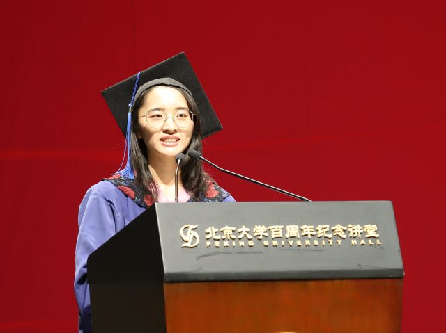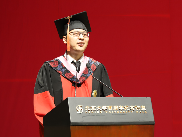 2014级英语系博士生安帅代表博士毕业生发言。安帅首先幽默地将博士毕业的自己戏称为“红袍加身”,接着又用西天取经做比,风趣地回顾了读博过程中投稿、查阅文献等艰辛历程。然后借“唐僧”的形象,生动而真切地表达了对导师在论文指导和思想启迪上所给予帮助的感激。他认为,导师的谆谆教诲,提高的不仅是学术的上限,更是做人的上限。最后,安帅介绍了自己在人文学科科普实习中的工作,提出人文学科需要更多的现实关照,这是北大人文学人应有的情怀和使命感。