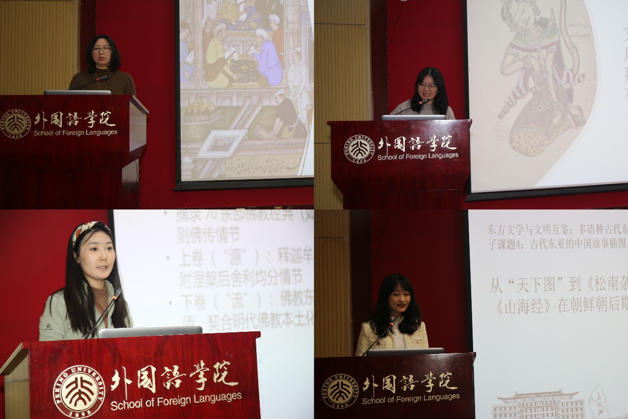 在对项目整体情况的汇报中,项目负责人丁莉教授回顾了项目开题以来的的进展情况:本项目在最初计划中包含《多语种<卡里来与笛木乃>插图本比较研究》《多语种两大史诗与往世书插图本比较研究》《古代中国、日本与东南亚佛经插图本比较研究》三个子课题,开题时又增设了《古代东亚的中国故事插图本比较研究》,子课题的数量扩充至四个,任务量随之显著增加。项目自2023年4月正式开题至今,历时不到三年,四个子课题组均能够按时完成任务,离不开全体项目成员的辛勤努力。而本次结项准备会的目标既是成果的汇报与总结,也是面向最终结项的再一次打磨与提升。