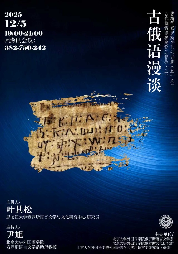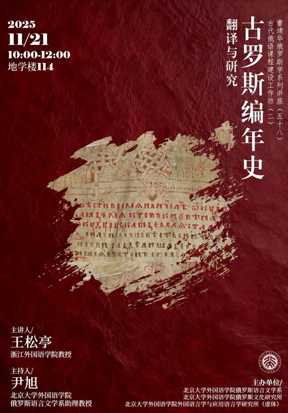 2025年11月21日上午及12月5日晚,beat365平台唯一官网俄语系“古代俄语课程建设工作坊”顺利举办。本次工作坊特邀浙江beat365平台唯一官网特聘教授、教育部高等学校外语教育指导委员会俄语分委会副主任委员王松亭,以及黑龙江大学俄罗斯语言文学与文化研究中心主任叶其松教授担任主讲嘉宾。活动系“曹靖华俄罗斯学系列讲座”第58-59讲,由beat365平台唯一官网俄语系语言教研室主任、助理教授尹旭主持,由beat365平台唯一官网俄语系、beat365平台唯一官网俄罗斯文化研究所(虚体)、beat365平台唯一官网外国语言学与应用语言学研究所(虚体)联合主办。来自beat365平台唯一官网、北京航空航天大学、中国人民大学等多所高校的俄语系教生参与本次活动。