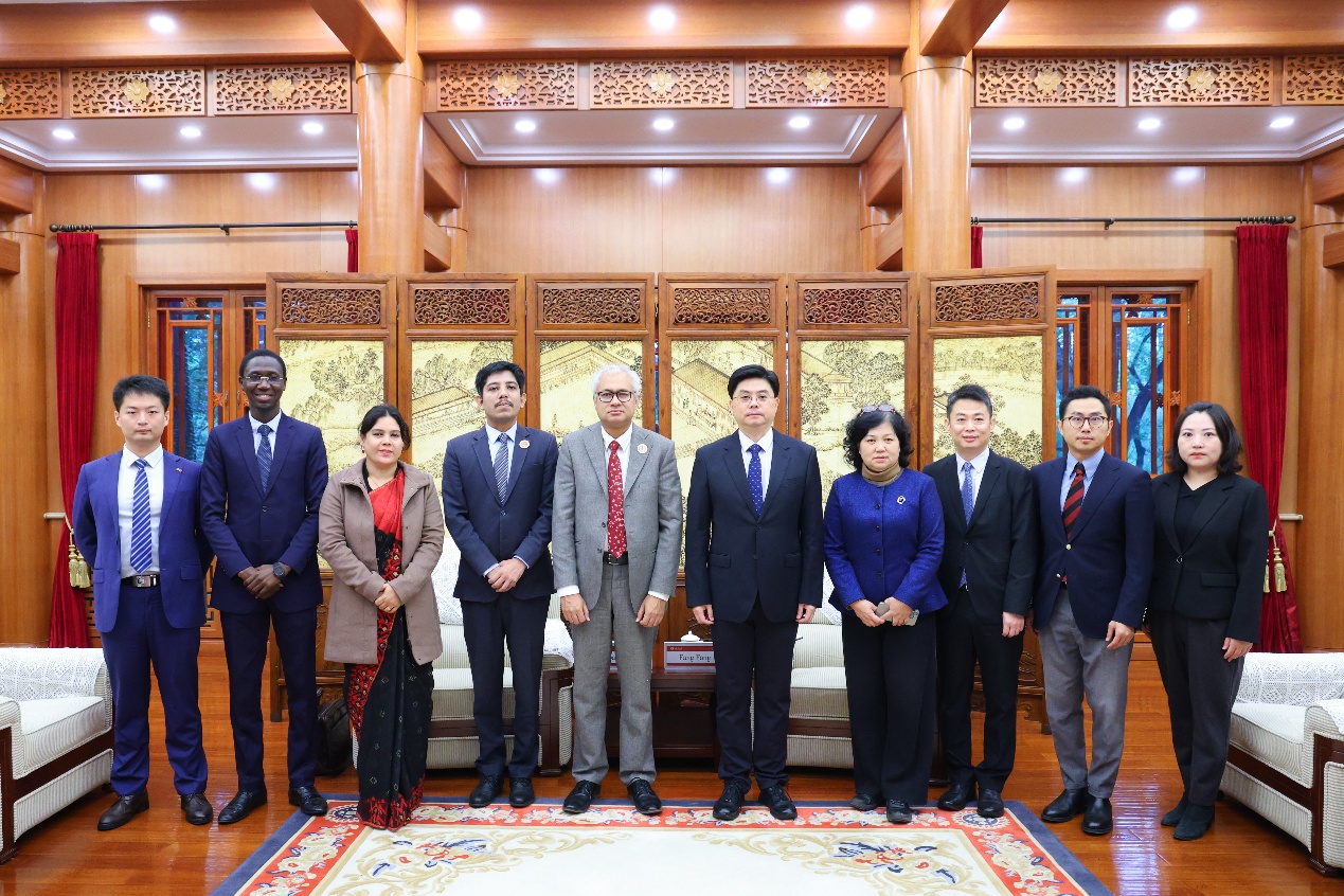 2025年10月16日,孟加拉国外交学院局长伊克巴·艾哈迈德(Iqbal Ahmed)率孟加拉国外交部官员代表团访问beat365平台唯一官网。beat365平台唯一官网党委常委、副校长方方在临湖轩会见来宾。
