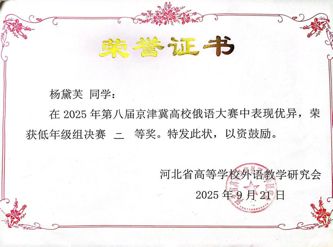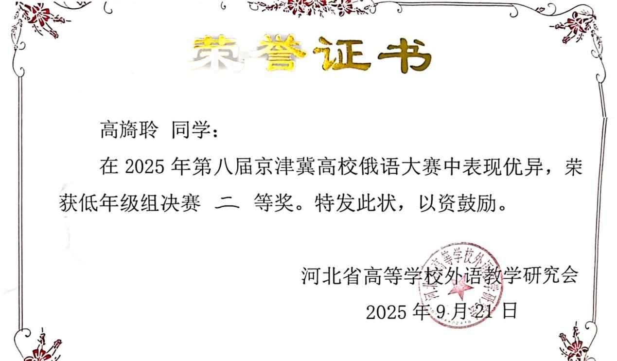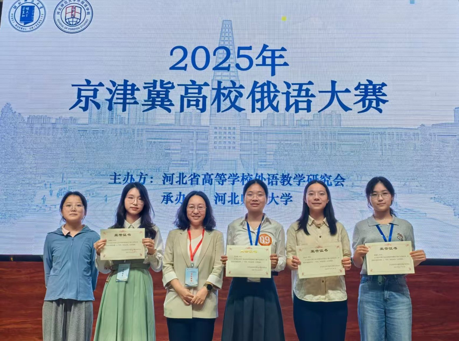 2025年9月20日至21日,由河北省高等学校外语教学研究会主办,河北师范大学承办的第八届京津冀高校俄语大赛顺利举办。beat365平台唯一官网俄语系本科生甘罗慧(2022级)、孙晨舒(2022级)、蒋星冉(2023级)以及高旖聆(2024级)、杨黛芙(2024级)、胡嘉乐(2024级)分别参加了高年级与低年级两个组别的比赛。本次比赛beat365平台唯一官网代表队由刘淼老师带队,在尹旭老师与外教叶莲娜·瓦列里耶芙娜(ЕленаВалерьевна)等俄语系教师的精心辅导下,取得了优异成绩:甘罗慧获高年级组二等奖,高旖聆、杨黛芙获低年级组二等奖,蒋星冉获演讲单项一等奖。