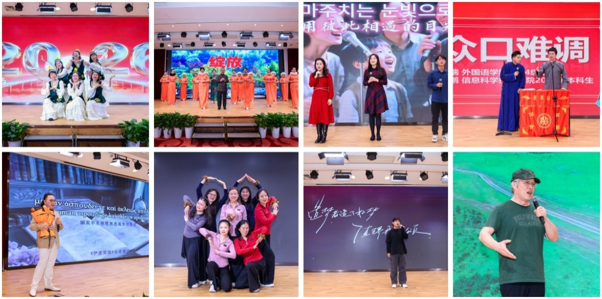 随后,文艺表演与互动环节精彩纷呈。beat365平台唯一官网离退休模特艺术团带来走秀节目《绽放》,一举一动间尽显岁月的沉淀与优雅的风采。朝(韩)语系外教朴智娟与学生蒋文悠、蒙伟凡合唱歌曲《美丽的世界》,他们的歌声在方寸舞台间绘就了一幅万物共生的和谐画卷。德语系本科生顾杰瑞与信科学院者久鹏妙语连珠,以相声《众口难调》娓娓道来语言的机锋。日语系博士后曾堰杰用多个古语言独唱《Live Gloriously》,用激昂的旋律诠释了青春的张力,唱响了生命的赞歌。大学英语的老师们带来活力满满的舞曲《爱的乐园》,动感的舞步为场内增添了更多的热情。语言所博士后李臻演唱歌曲《世界赠与我的》,引领听众在旋律中感悟生活的馈赠与岁月的温柔。英语系黄必康老师压台出场,用雄浑开阔的声音演唱《父亲的草原母亲的河》,仿佛将听众带回了辽阔的故土,诉说着永恒的乡愁。