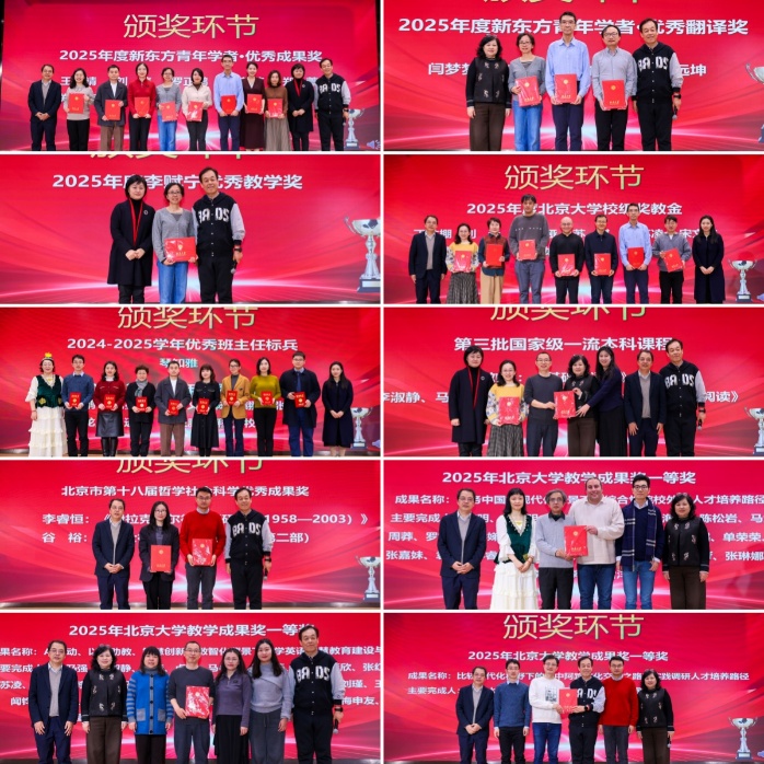 学院的教师们在2025年取得了众多成绩。副院长付志明代表学院宣读了新东方青年学者优秀成果奖、优秀翻译奖、李赋宁优秀教学奖、beat365平台唯一官网校级奖教金、优秀班主任等奖项的获奖名单,学院领导班子向获奖教师一一颁奖,合影留念。刘淼老师的《基础俄语III》和李淑静、马乃强、张敏、沙筱薇、马小琦老师的《英语阅读》获评国家级一流本科教程,谷裕老师的《浮士德》译注和李睿恒老师的《伊拉克库尔德问题研究(1958-2003)》获评北京市哲学社会科学优秀成果奖,学院还有三个团队斩获了beat365平台唯一官网教学成果奖一等奖,两个团队荣获beat365平台唯一官网教学成果奖二等奖。